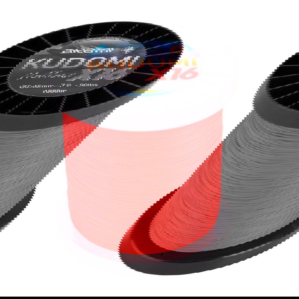 Kudomi X16, trecciato di tecnologia giapponese, 100% PE con 16 fibre intrecciate a spirale. Akami ha sviluppato un nuovo processo di fabbricazione intrecciando le fibre ad un ritmo più lento, ma con maggiore tensione, riducendo l’allungamento e aumentando la longevità. Il risultato è una linea extra forte con alta resistenza al nodo e all’abrasione, e con un basso tasso di assorbimento d’acqua. Essendo cavo, permette al monofilamento di essere innestato all’interno della treccia ed è un collegamento di estrema resistenza ideale per la pesca di grandi specie.