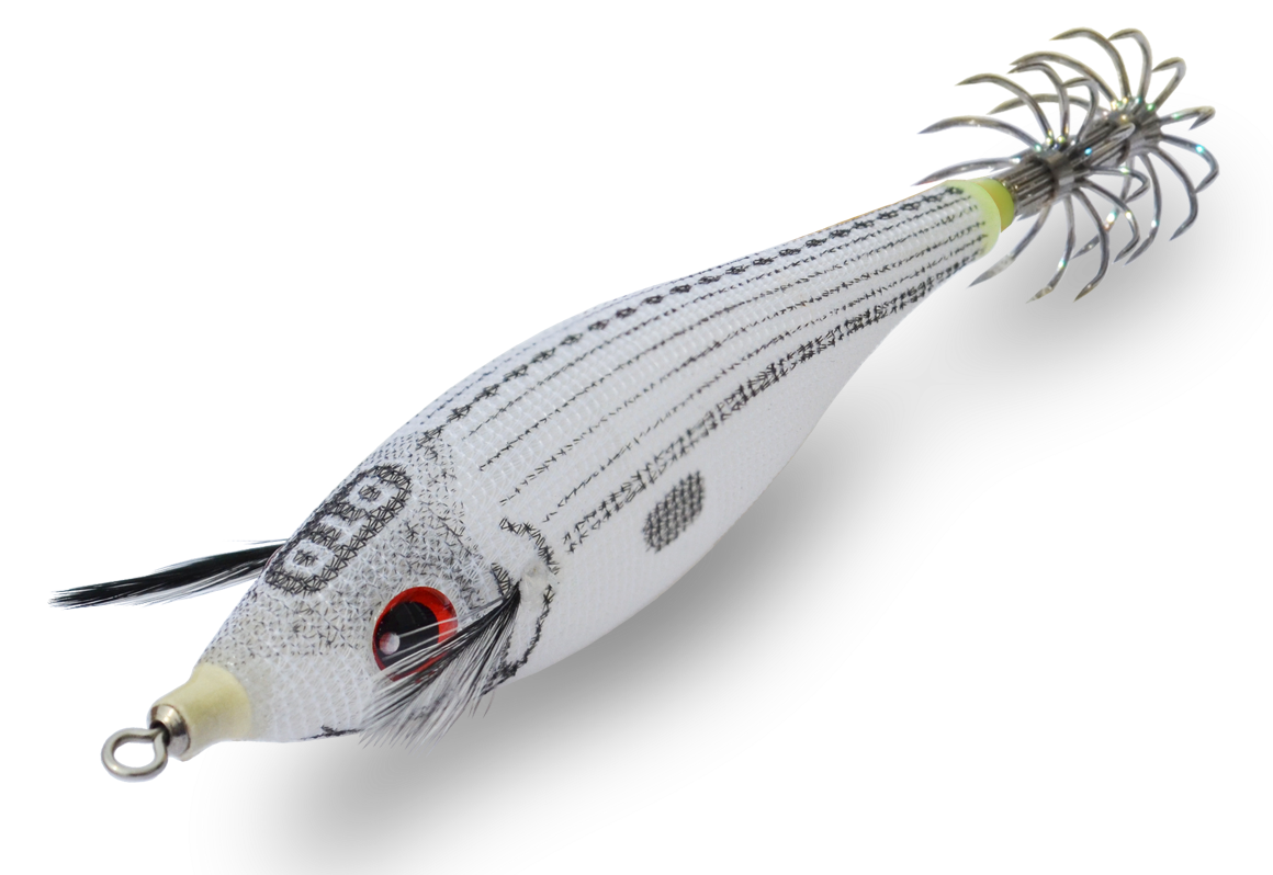 Bijela Gira DTD ideata per la pesca a dalla barca. Una totanara con corpo estremamente realistico e luminoso ricoperto da un sottile strato di tessuto, occhi rossi fluorescenti, ottimo bilanciamento, 2 corone in acciaio.