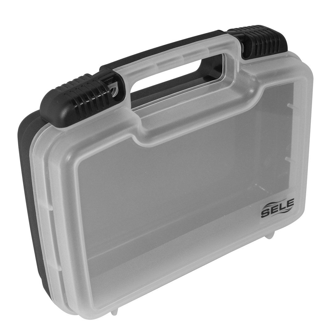 Scatola porta terminali, in plastica resistente trasparente con base nera. Studiata per contenere terminali ed accessori, durante il trasporto.